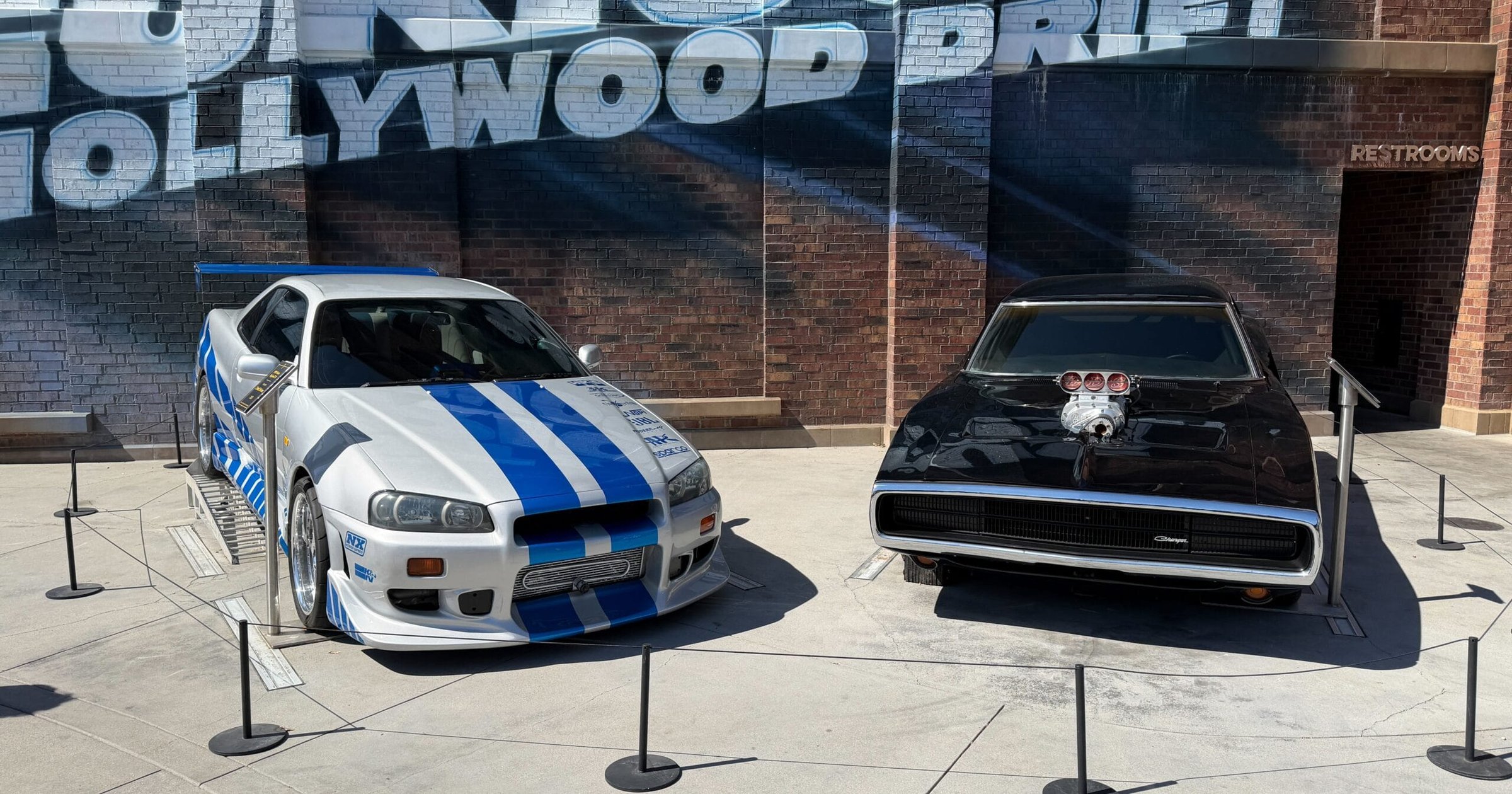 The display, located in front of the bold "Fast & Furious: Hollywood Drift" signage, features a pair of legendary rides, each surrounded by stanchions to keep eager fans at bay. On one side, behold the sleek silver and blue 1999 Nissan Skyline GT-R, famously driven in the 2003 sequel 2 Fast 2 Furious. On the other side stands the imposing black 1970 Dodge Charger, a nod to the adrenaline-packed original 2001 film, The Fast & the Furious.